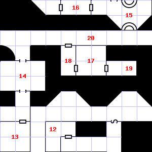 | 13 | The air here is very hot. This area smells faintly of urine. It is foggy here, making it difficult to see. There are cracks in the floor here. | 14 | A slight, damp breeze blows through this area. Encounter: Skeletons (8) Treasure: As per monster type. | 15 | A cold air current blows through this area. There is a mold growing here. Encounter: Sprites (11) Treasure: None. |