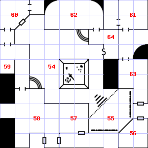 | 67 | This area has a pleasant, earthy smell. Treasure: 600sp. Trap: Flash of light: Save vs. Spells or be blinded for 1d8 turns (1d8x10 minutes). | 68 | There is a mold growing here. | 69 | Treasure: 500sp. |