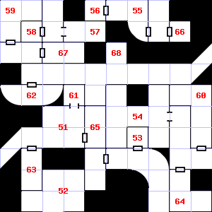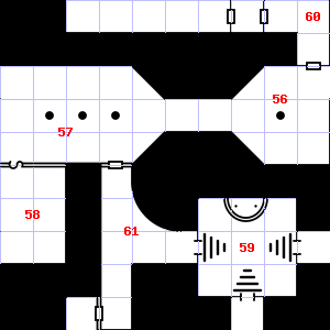 | 61 | A strong, moaning wind blows through this area. This area has a stale, fetid smell. There is water dripping here. Encounter: Halflings (5) Treasure: None. | 62 | A slight, damp breeze blows through this area. This area smells of rotting vegetation. | 63 | A slight, damp breeze blows through this area. |