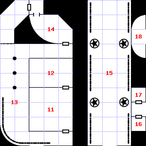 | 10 | 11 | This area smells of rotting vegetation. The remnants of a rope are here, rotten. Encounter: Acolytes (2) Treasure: None. | 12 | This area smells faintly of urine. | |