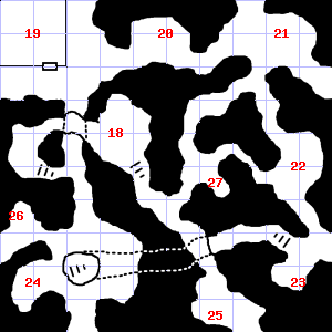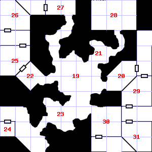 | 19 | There is a broken arrow here. | 20 | A strong updraft blows through this area. This area has a stale, fetid smell. This area is very dusty. Encounter: Goblins (5) Treasure: None. | 21 | The air here is very hot. Treasure: 100sp. Trap: Illusion of monsters: Beetles, Fire (6) |
