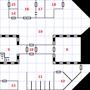 | 13 | 14 | A slight breeze blows through this area. Your nostrils are overwhelmed by a sulphurous smell. Encounter: Goblins (5) Treasure: As per monster type. | 15 | This area smells faintly of manure. There is a pile of rags here. Encounter: Green Slimes (4) Treasure: As per monster type. | |