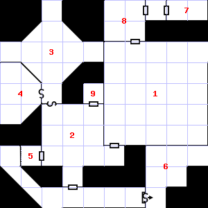 | 64 | This area has a pleasant, earthy smell. This area is covered in cobwebs. Encounter: Acolytes (3) Treasure: None. | 65 | 66 | A haze of smoke hangs in the air. There are sticks scattered here. Encounter: Traders (3) Treasure: None. | |