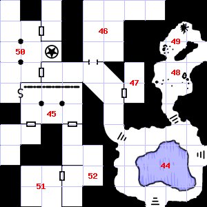 | 49 | This area has a pleasant, earthy smell. | 50 | This area is very dusty. Treasure: 600sp. | 51 | A strong, moaning wind blows through this area. There is a pile of ashes here. |