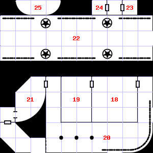 | 13 | There are wax drippings here. Treasure: 500sp. Trap: Spray: Unknown liquid that attracts Wandering Monsters; double chances for 1d6 hours. | 14 | Encounter: Sprites (6) Treasure: As per monster type. | 15 | Treasure: 100sp, 40gp. |