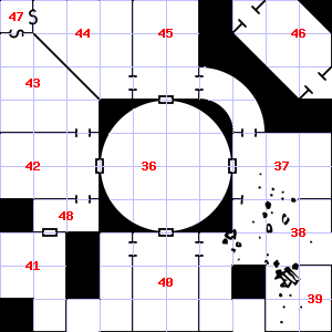 | 40 | 41 | A slight updraft blows through this area. Treasure: 300sp. Trap: Illusion of monsters: Green Slimes (4) | 42 | Trap: Pendulum blade from ceiling: 1d8 points of damage. | |