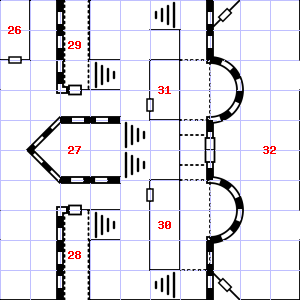 | 28 | A strong, moaning wind blows through this area. The air here smells of smoke. There are dry leaves and twigs scattered here. Encounter: Goblins (4) Treasure: None. | 29 | Encounter: Acolytes (4) Treasure: None. | 30 | The air here smells of smoke. Encounter: Gnomes (3) Treasure: None. |