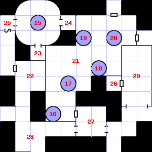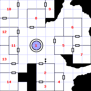| 13 | The air here is very hot. This area is covered in cobwebs. | 14 | A slight downdraft blows through this area. There is a torn sack here. Trap: Poison gas: Save vs. Poison or die. | 15 | A slight updraft blows through this area. Treasure: 600sp. Trap: Poison needle: Save vs. Poison or die. |