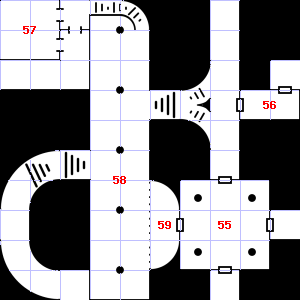| 55 | Encounter: Acolytes (7) Treasure: None. | 56 | Fog gathers and swirls on the floor, concealing it. Treasure: 200sp, 60gp. | 57 | This area has a pleasant, earthy smell. There is a pick handle here. |