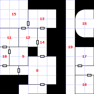 | 10 | This area has a pleasant, earthy smell. Treasure: 500sp. | 11 | Trap: Chute: No damage, but slide to the next level down (ignore if there is no lower level). | 12 | This area smells faintly of manure. There is a pile of ashes here. |