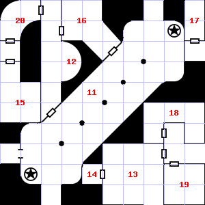 | 10 | This area is covered in cobwebs. | 11 | This area is covered in cobwebs. | 12 | The air here is very cold. This area smells of rotting vegetation. There is a bent and rusted iron bar here. Treasure: 300sp, 20gp. |