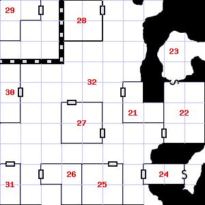 | 25 | This area has a stale, fetid smell. Trap: Pendulum blade from ceiling: 1d8 points of damage. | 26 | The air here is very cold. There is a bent and rusted iron bar here. Encounter: Wolves (6) Treasure: As per monster type. | 27 | This area smells faintly of urine. Encounter: Beetles, Fire (1) Treasure: None. |