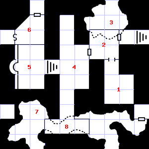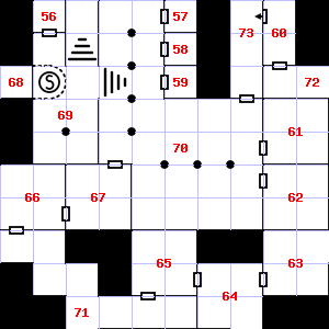 | 70 | A slight, damp breeze blows through this area. Trap: Pendulum blade from ceiling: 1d8 points of damage. | 71 | 72 | A strong downdraft blows through this area. This area smells faintly of manure. There is a small puddle of water here. | |