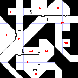 | 19 | This area has a pleasant, earthy smell. It is foggy here, making it difficult to see. There is a trickle of water here. | 20 | A slight, damp breeze blows through this area. This area smells faintly of manure. There is a pile of dung here. Trap: Fog: Looks like poison gas, but harmless. | 21 | There is a blunt javelin head here. |