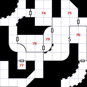 | 76 | A slight, damp breeze blows through this area. A haze of smoke hangs in the air. Trap: Ceiling Block falls: Save vs. turn to Stone or take 1d10 points of damage. | 77 | This area smells faintly of manure. The wall here is damp. Trap: Fog: Looks like poison gas, but harmless. | 78 | A slight breeze blows through this area. The smell of ozone assails your nostrils. There is a pile of rags here. Treasure: 400sp. |