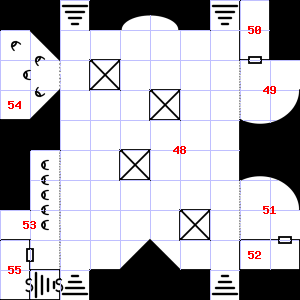 | 46 | The air here is very cold. There are rotting wood pieces here. Treasure: 500sp, 20gp, 1 gems. | 47 | A strong wind blows through this area. This area is very dusty. Encounter: Halflings (12) Treasure: None. | 48 | A cold air current blows through this area. Treasure: 400sp, 60gp. |
